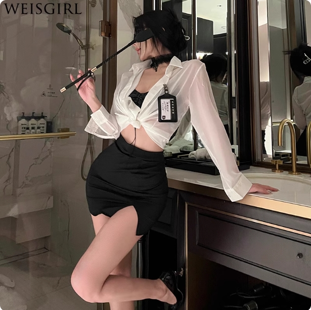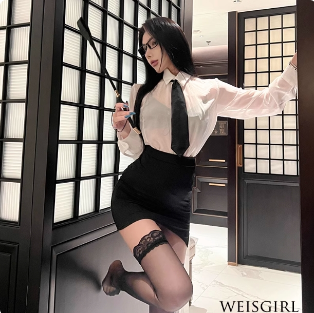 - Full OL look: Wear the set with the silk tie neatly tied, and add sheer nude ankle socks (with lace trim). The crisp collar and sheer torso channel “office elegance” with a sexy twist.