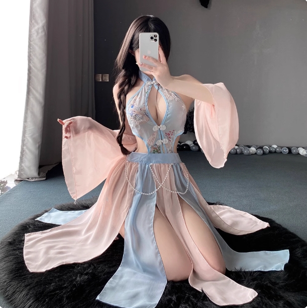 First, the cultural design details steal the spotlight. Drawing from Hanfu’s iconic cross-collar (jiaoling youren) and Qipao’s mandarin collar and side slits, the set feels like a love letter to traditional Chinese fashion – but reimagined for intimacy. Delicate frog buttons (pan Kou), subtle embroidered accents (think tiny peonies or cloud motifs), and a tailored silhouette that flatters curves pay homage to Hanfu/Qipao’s grace, while keeping the design playful and seductive.